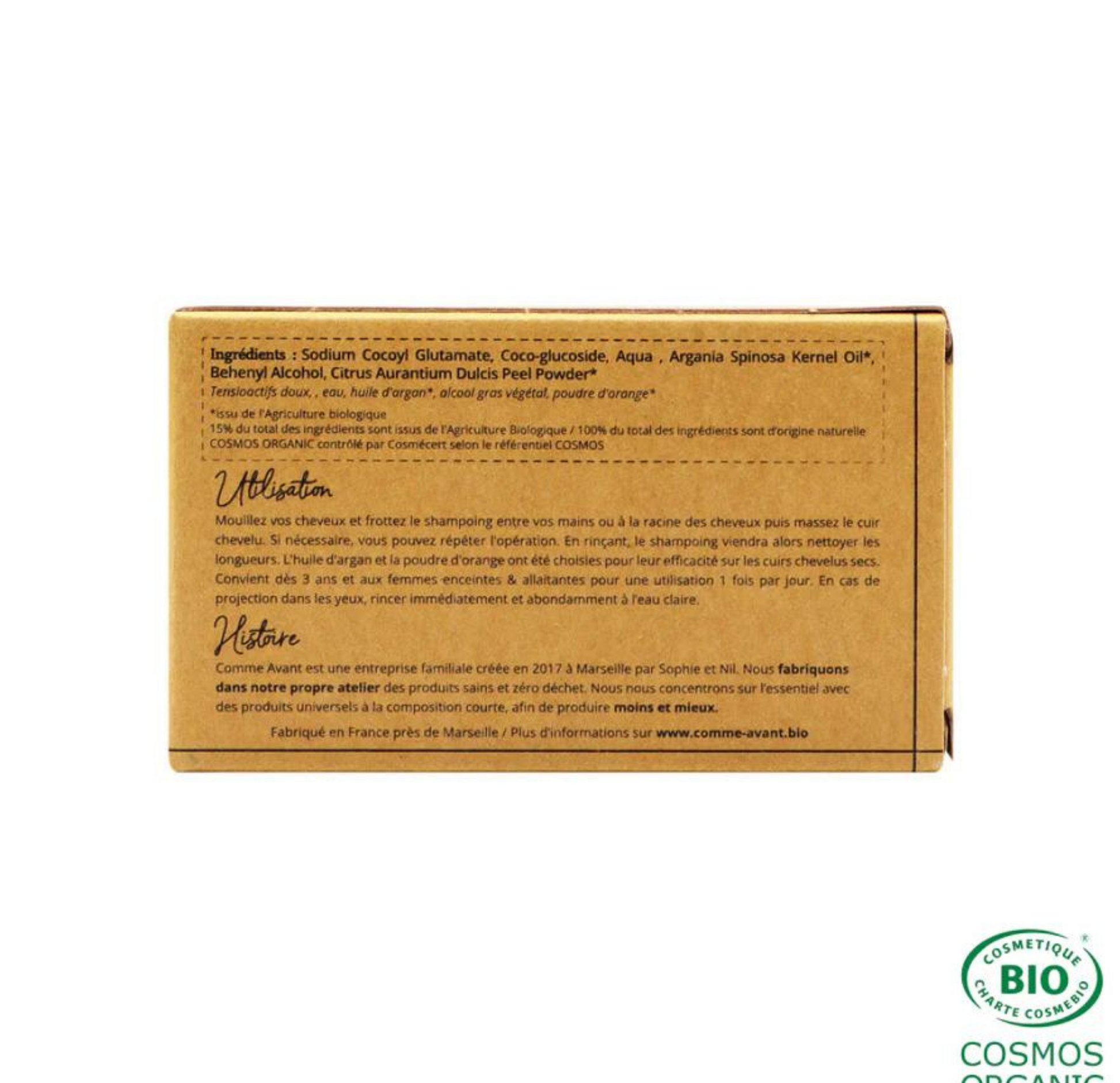 À partir de la composition du shampoing solide à l'huile de noisette, Comme Avant enrichi cette version avec deux ingrédients pour le rendre mieux adapté aux cheveux secs. Cette formule aide à tonifier les cheveux secs et cassants pour les rendre plus souples et brillants.