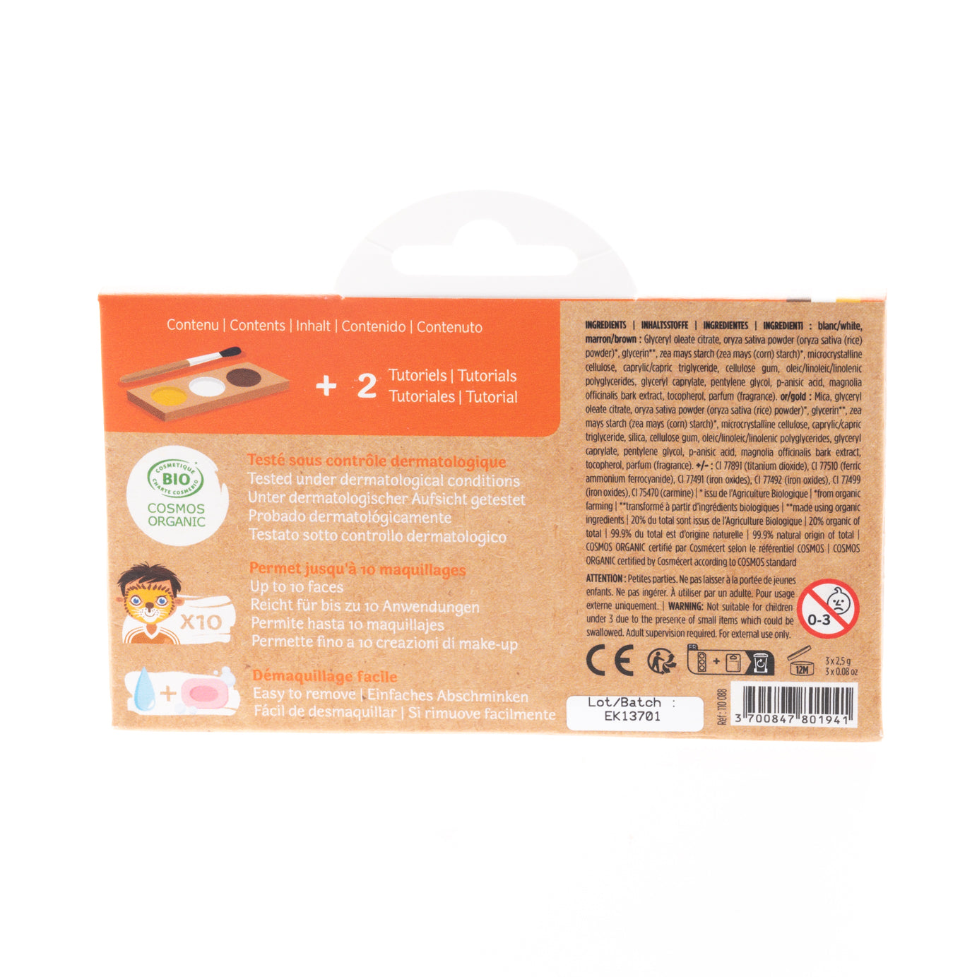 Déguisez-vous en lion ou en girafe grâce à ce kit de maquillage à l’eau certifié bio et hypoallergénique contenant une palette de 3 couleurs (or, blanc, marron), 2 modèles de maquillage et 1 pinceau.